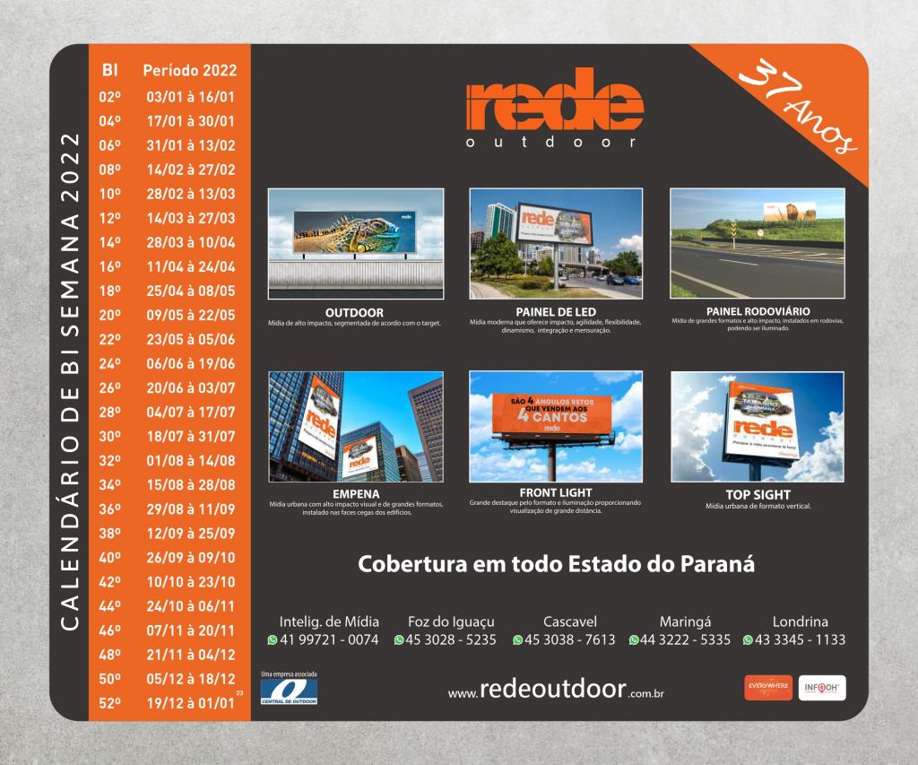 Você sabe como estipulamos nossa programação? O calendário de Bi Semanas, criado em 31/08/2001, trata-se de uma tabela de datas onde estipula-se detalhadamente o início e o fim de cada colagem, com a finalidade de padronizar a veiculação nacional de campanhas publicitárias em outdoor. (Central de Outdoor)